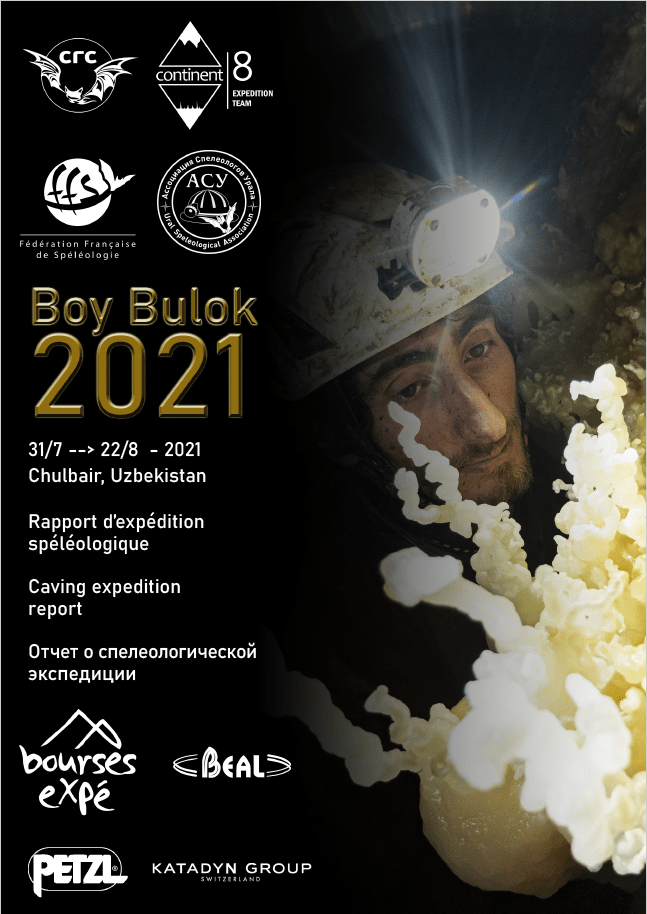 Stähelin L, Malard A, Aigueperse A, Team Continent 8 (2019) Boy Bulok 2018; une expédition franco-helvético-russe en Ouzbékistan / Boy Bulok 2018; eine franco-helvetisch-russische Expedition in Usbekistan. Stalactite 69(1), p 40-49.